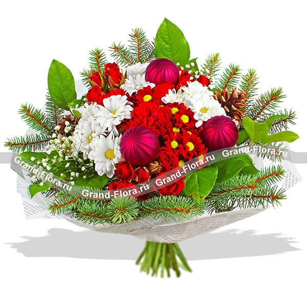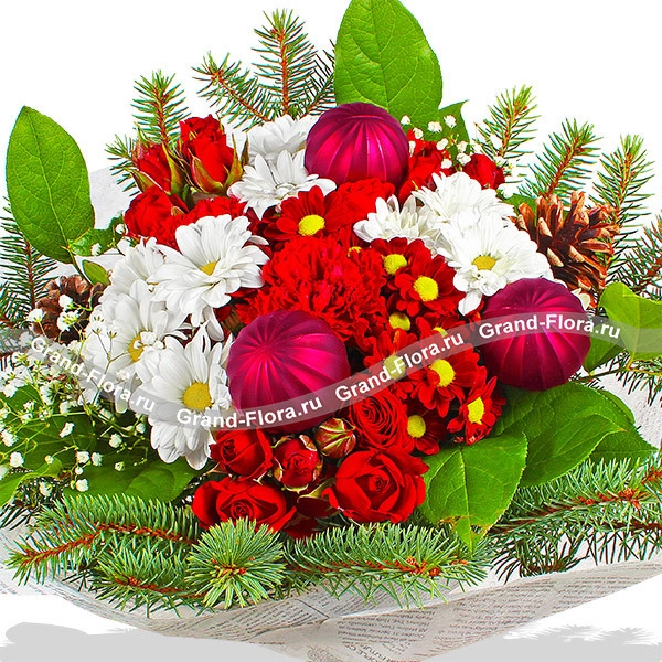 Уменьшенный: хризантема красная кустовая - 2шт., хризантема белая кустовая - 2шт., гвоздика красная - 3шт., роза красная кустовая - 1шт., гипсофила - 1шт., еловая ветвь, новогодний декор и зелень, фетр белый.