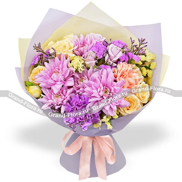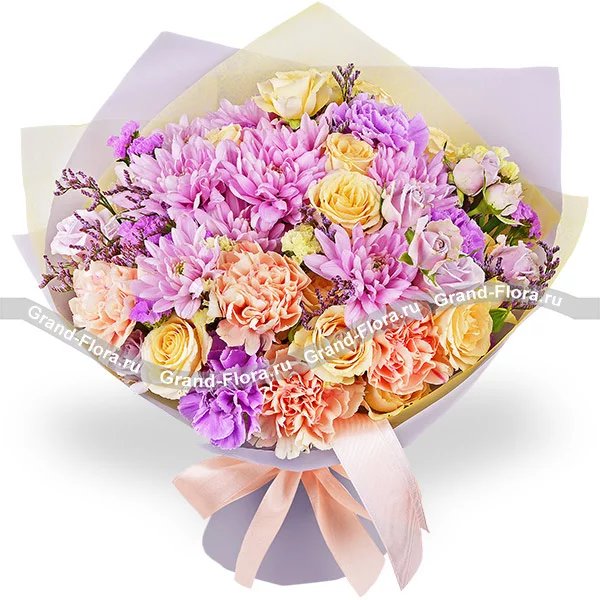 Люкс: гвоздика фиолетовая - 3 шт., гвоздика персиковая - 4 шт., хризантема кустовая ромашковая фиолетовая - 3 шт., кустовая роза желтая - 3 шт., кустовая роза фиолетовая - 2 шт., статица, лимониум, упаковка, лента. Примерный размер: 40Х40 см.