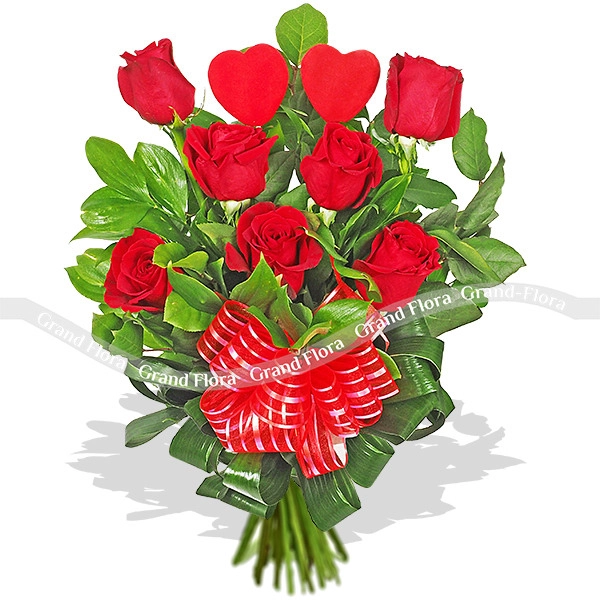 Яркое великолепие букета из роз «От всего сердца», словно магический талисман, рожденный весенним солнцем. Розы сочного, теплого оттенка, восходящего ярила в обрамлении игривой зелени, словно символизируют начало весны и любви. Подобранные в тон цветам ленты, как солнечные лучи пронизывают композицию. Если бы чувства можно было подержать в руках – они выглядели бы именно так – как этот букет, а два сердечка в центре этой композиции не оставят никаких сомнений, относительно Ваших намерений.